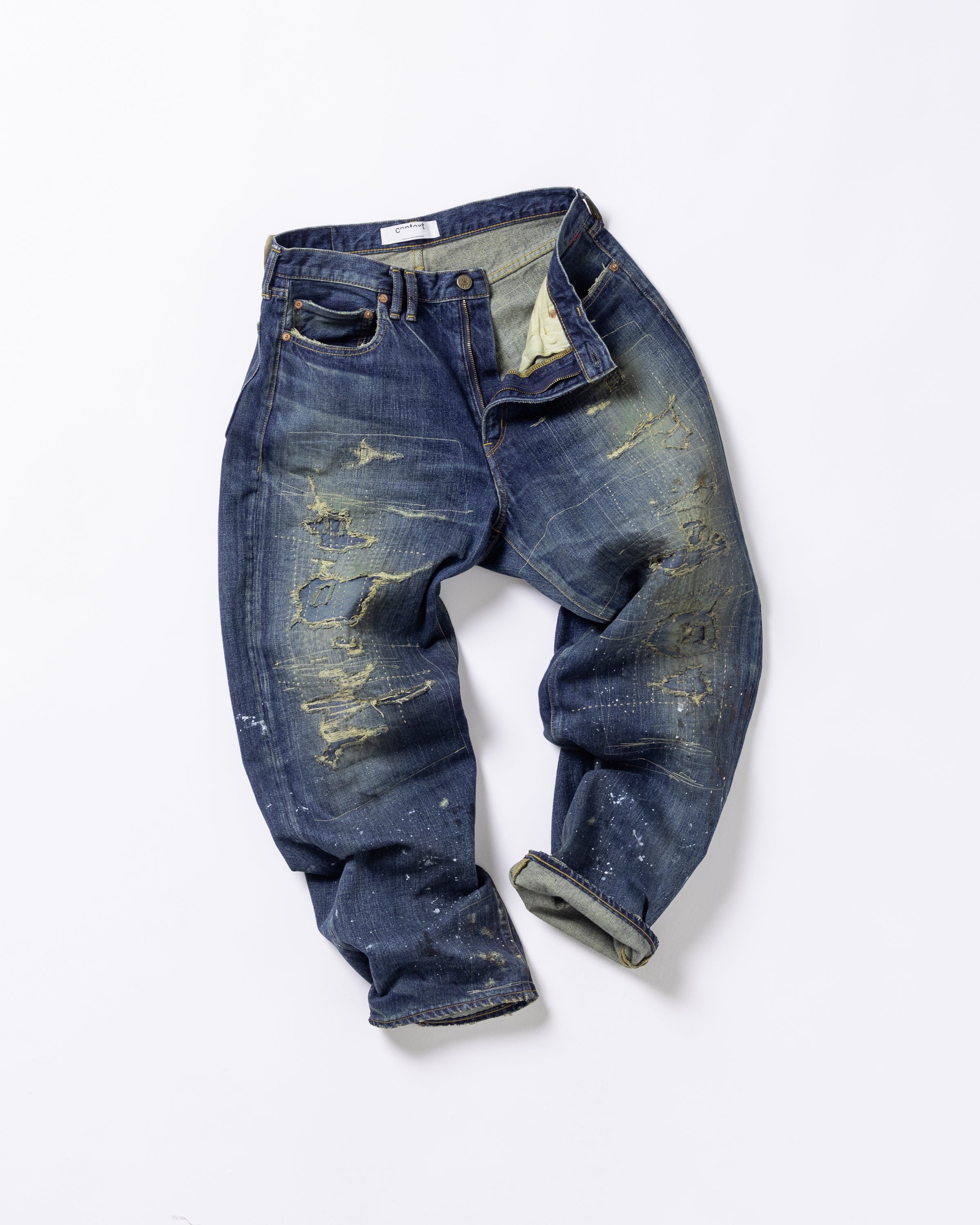 全体的に濃色エイジングとブリーチ加工で仕上げ、随所に激しくダメージを施し複数の当布でパッチワークリメイクしております。