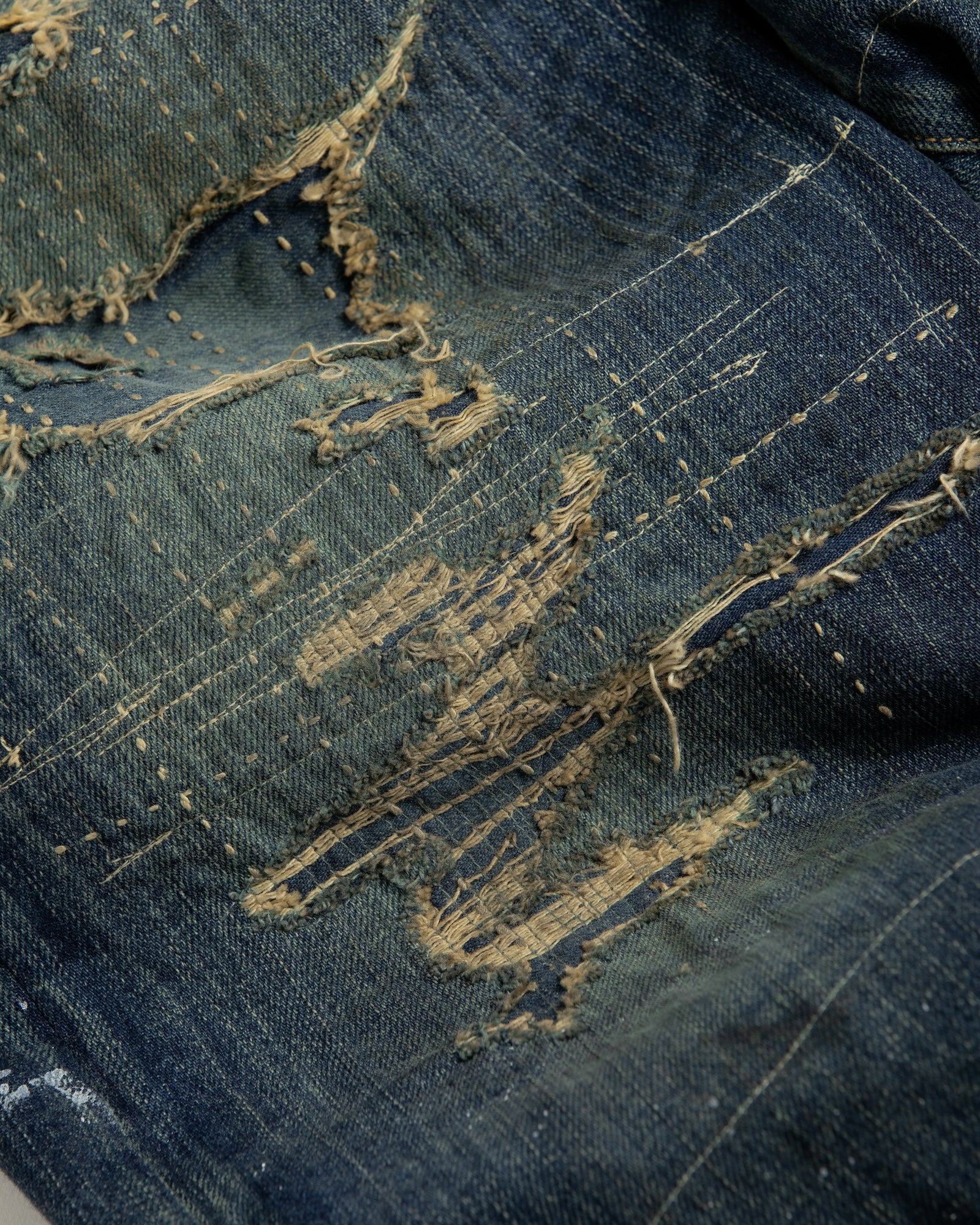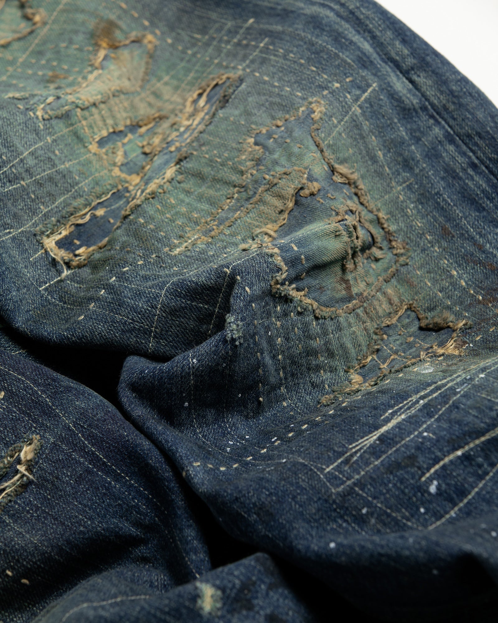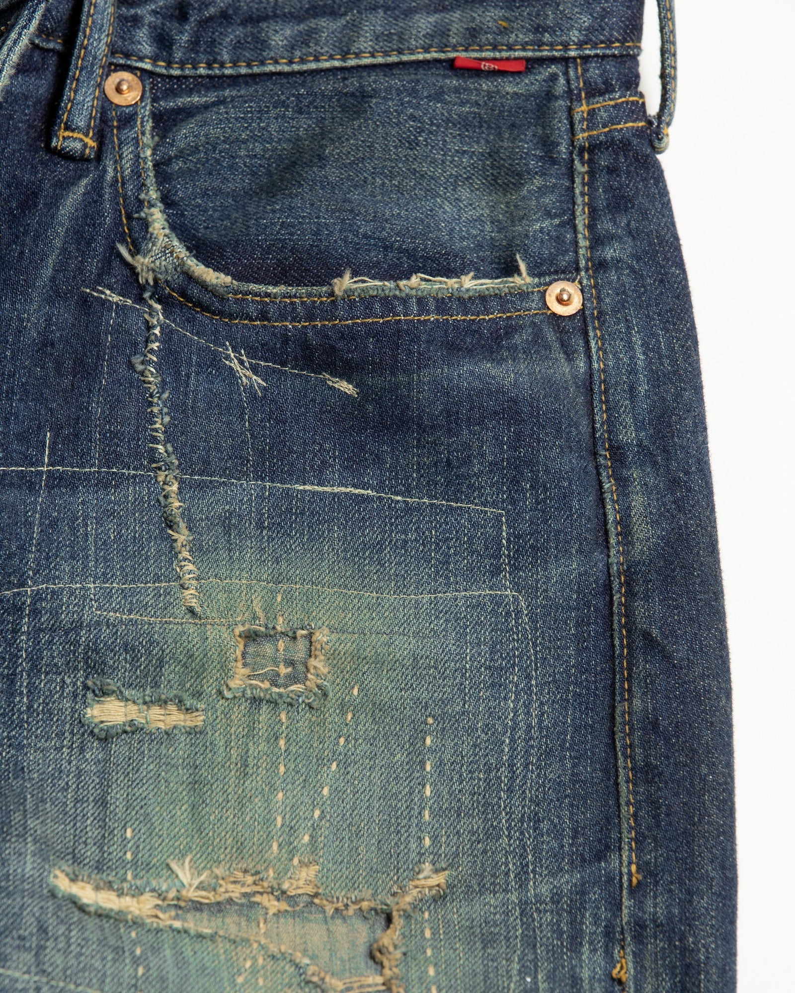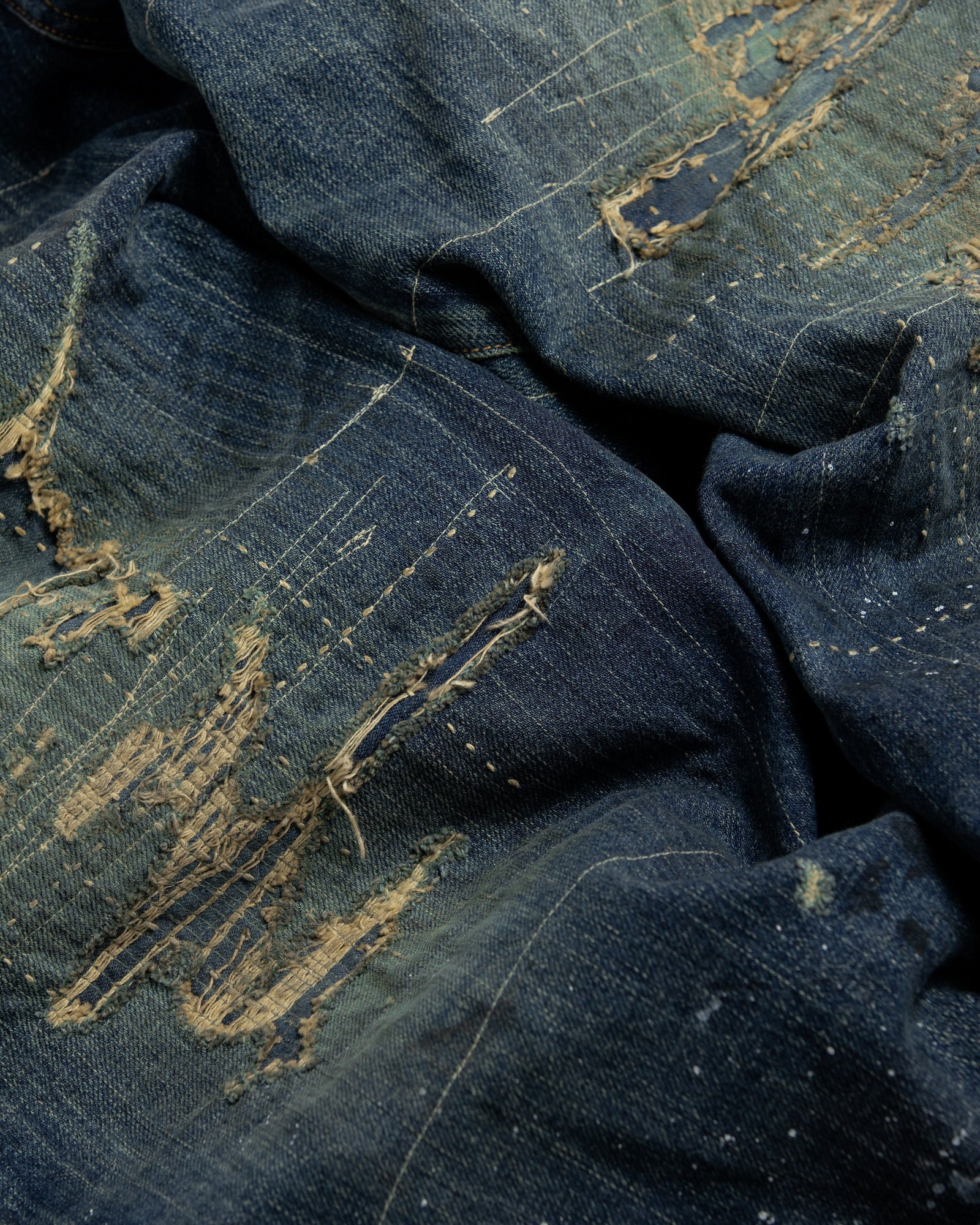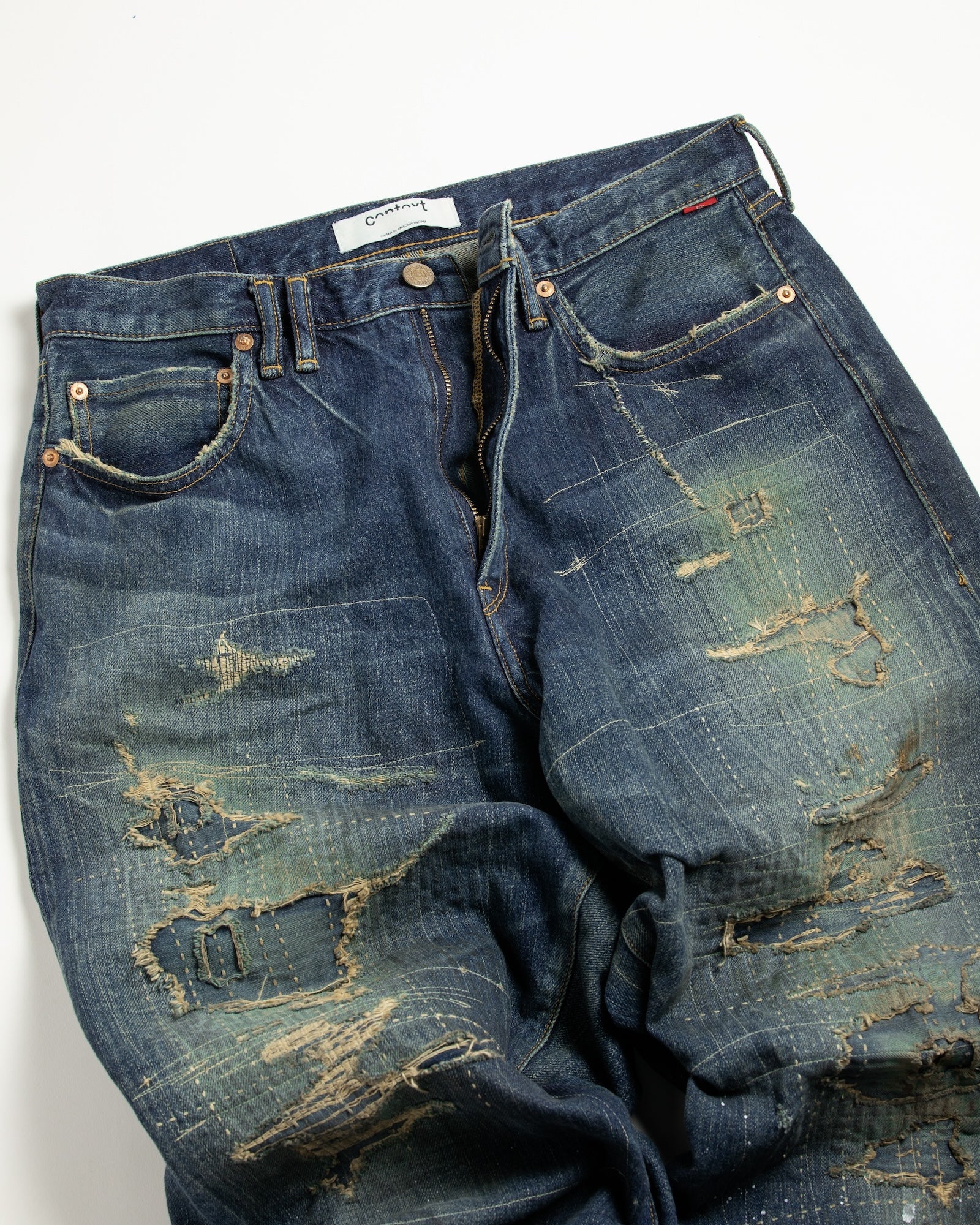 Finished with overall dark aging and bleach processing, featuring intense distressing throughout and multiple fabric patches for a patchwork remake.