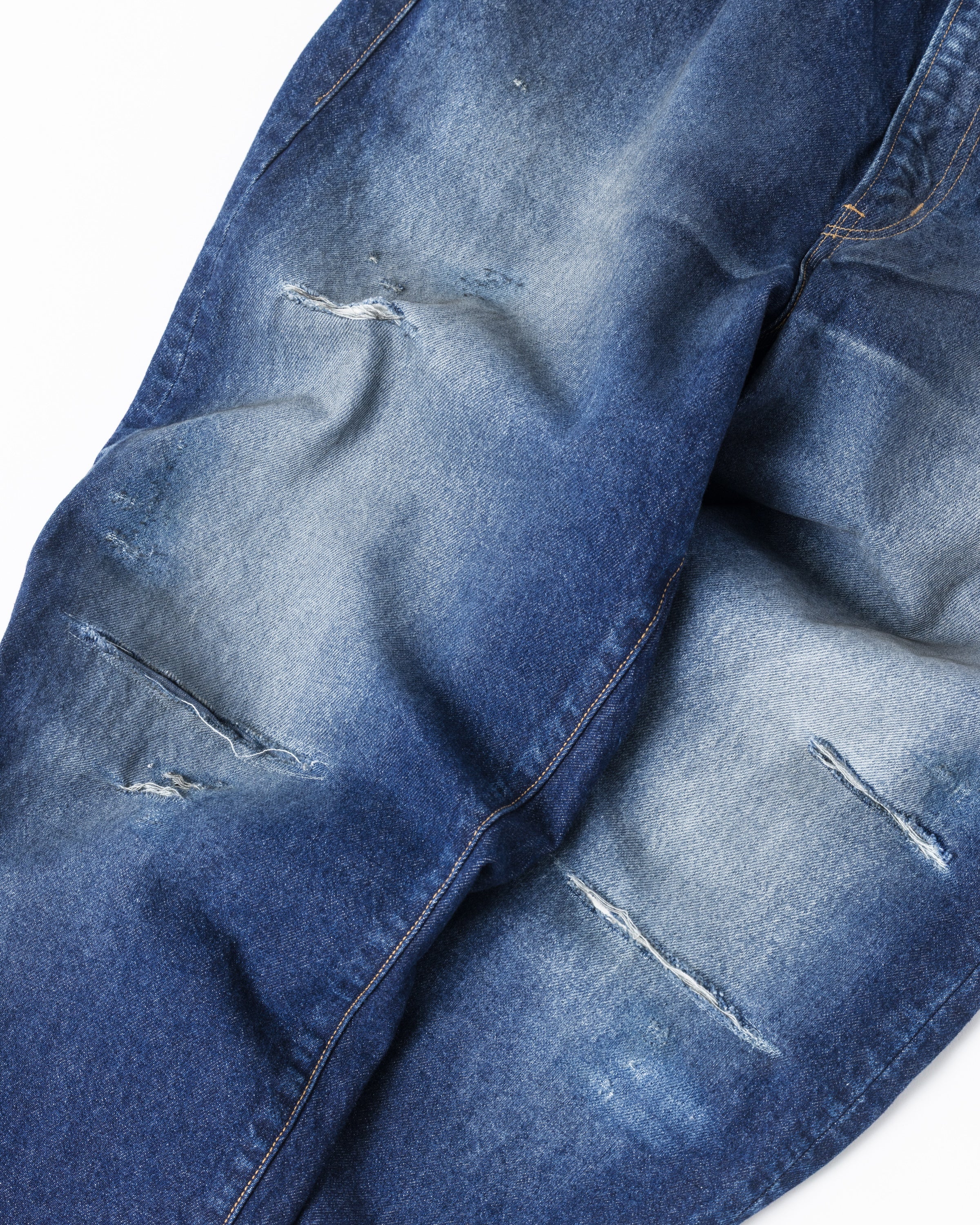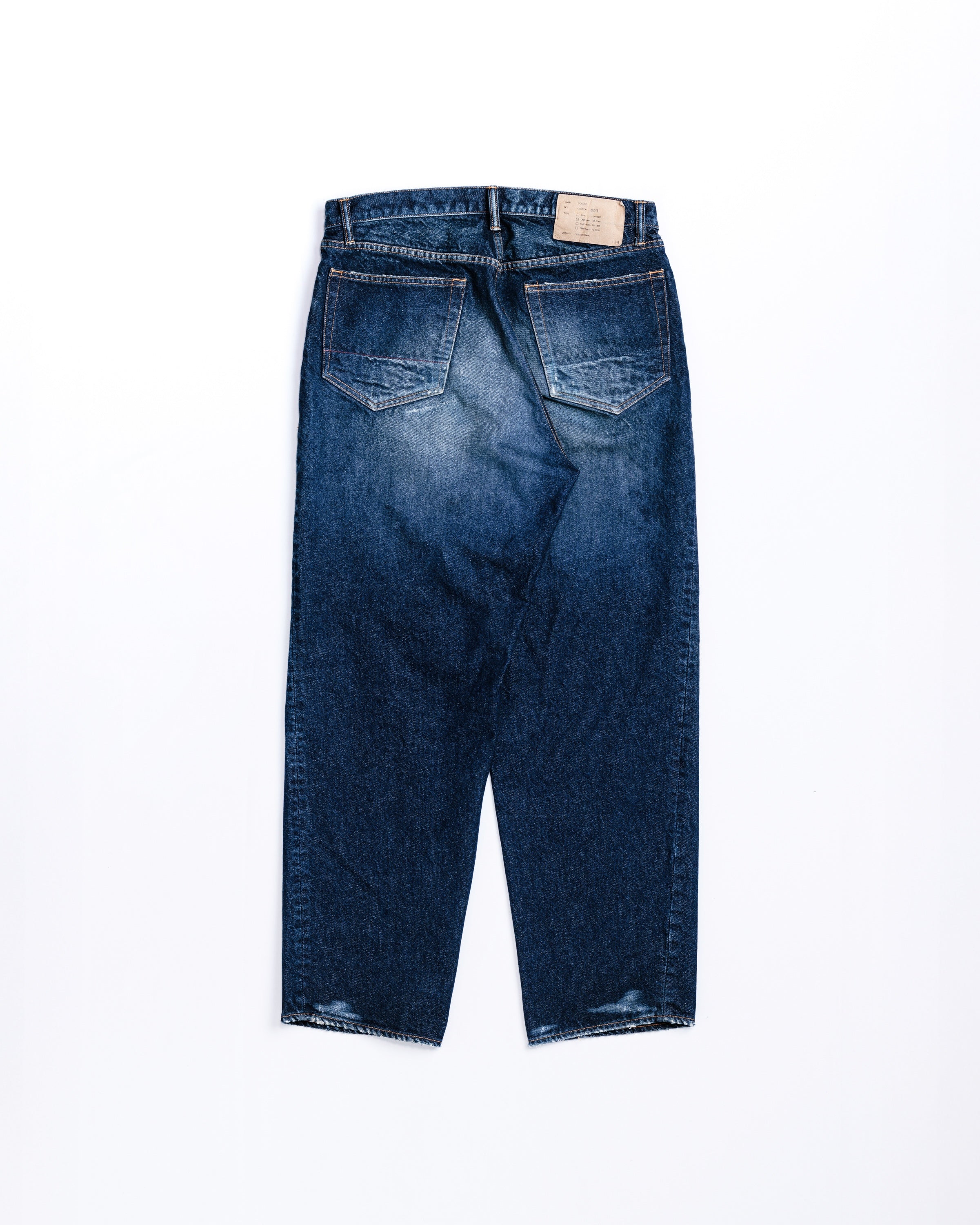[26 REMAKE]中濃色エイジングリメイク加工 全体的に色落ちした色味とハードなアタリ感が特徴。経年によるダメージをリペアしたリアルな雰囲気のリメイクを施しています。 更に最終仕上げで全体には汚し加工にてユーズド感を表現。 Mid-tone aged remake finish. Characterized by an overall faded wash and heavy "atari" (high-contrast wear marks).This piece features realistic repair work that mimics years of natural distressing. To top it off, a final tinting process is applied to create an authentic, grimy vintage aesthetic.