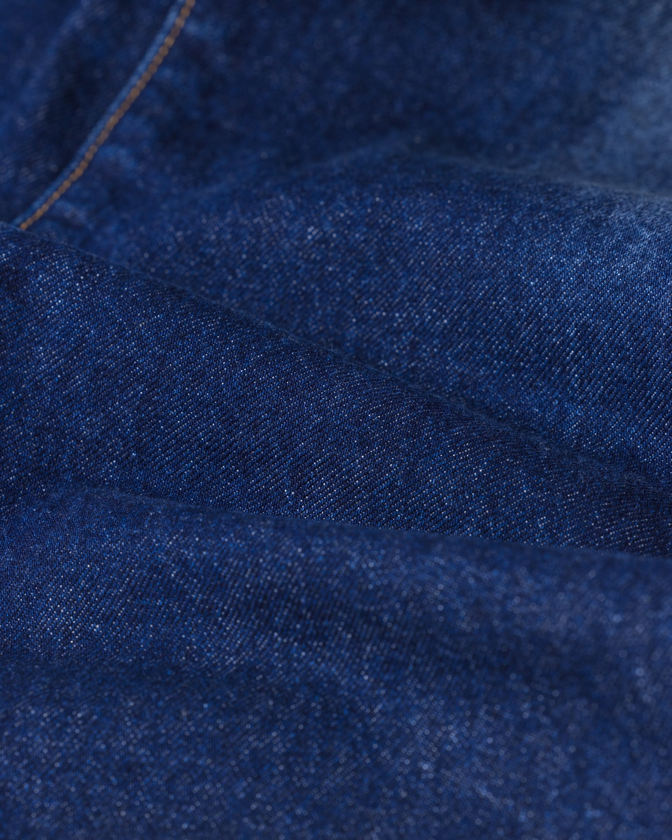 Reproduction of denim (Hachimaru) from the period when Levi's shifted from eared to earmarked denim. It has a flat look that is different from the vintage denim, which had a pronounced uneven yarn.