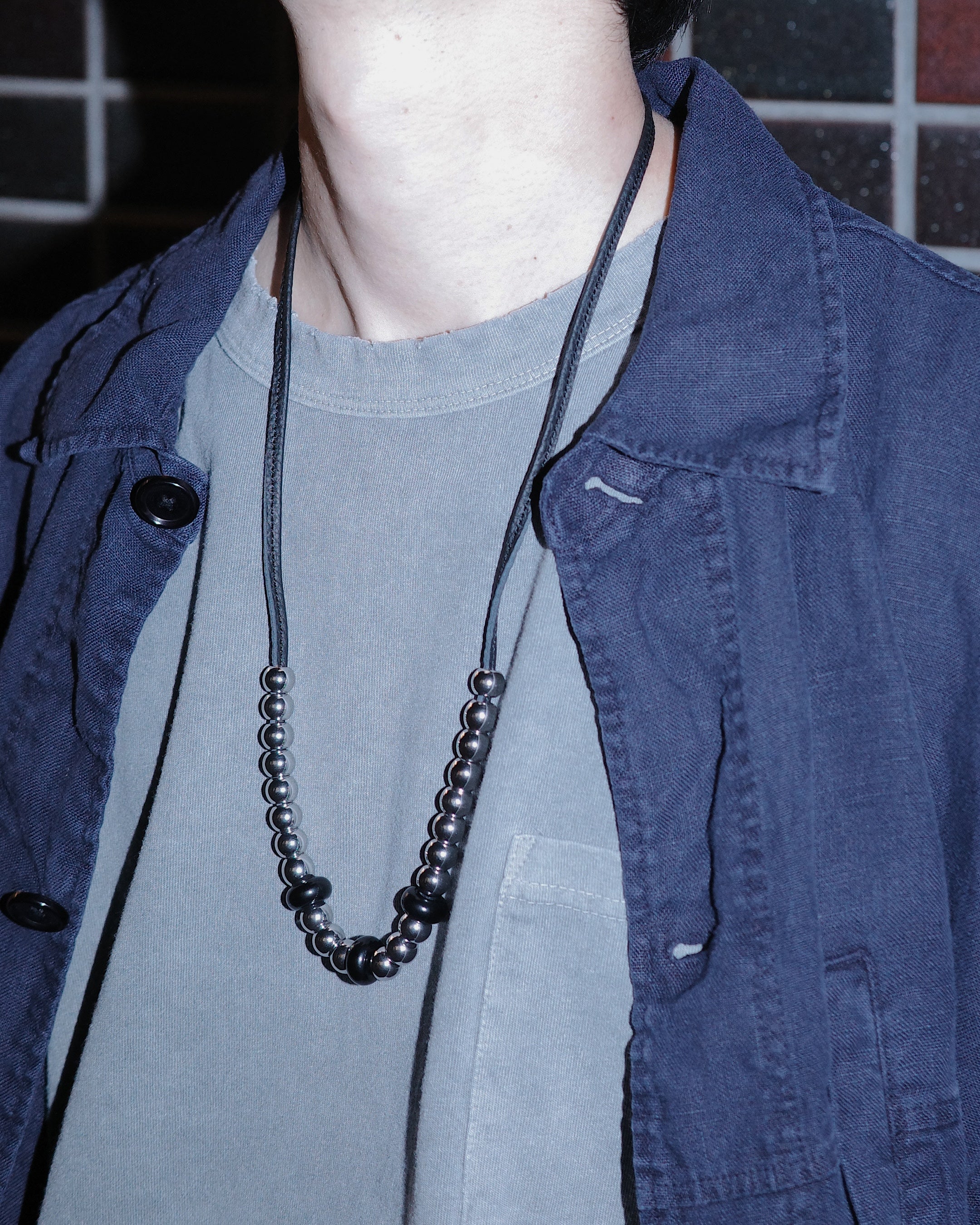 A necklace featuring alloy beads and natural stones. It harmonizes nature with urban elements and history. This leather is imported German leather. Its semi-aniline finish provides strength against scratches and water.