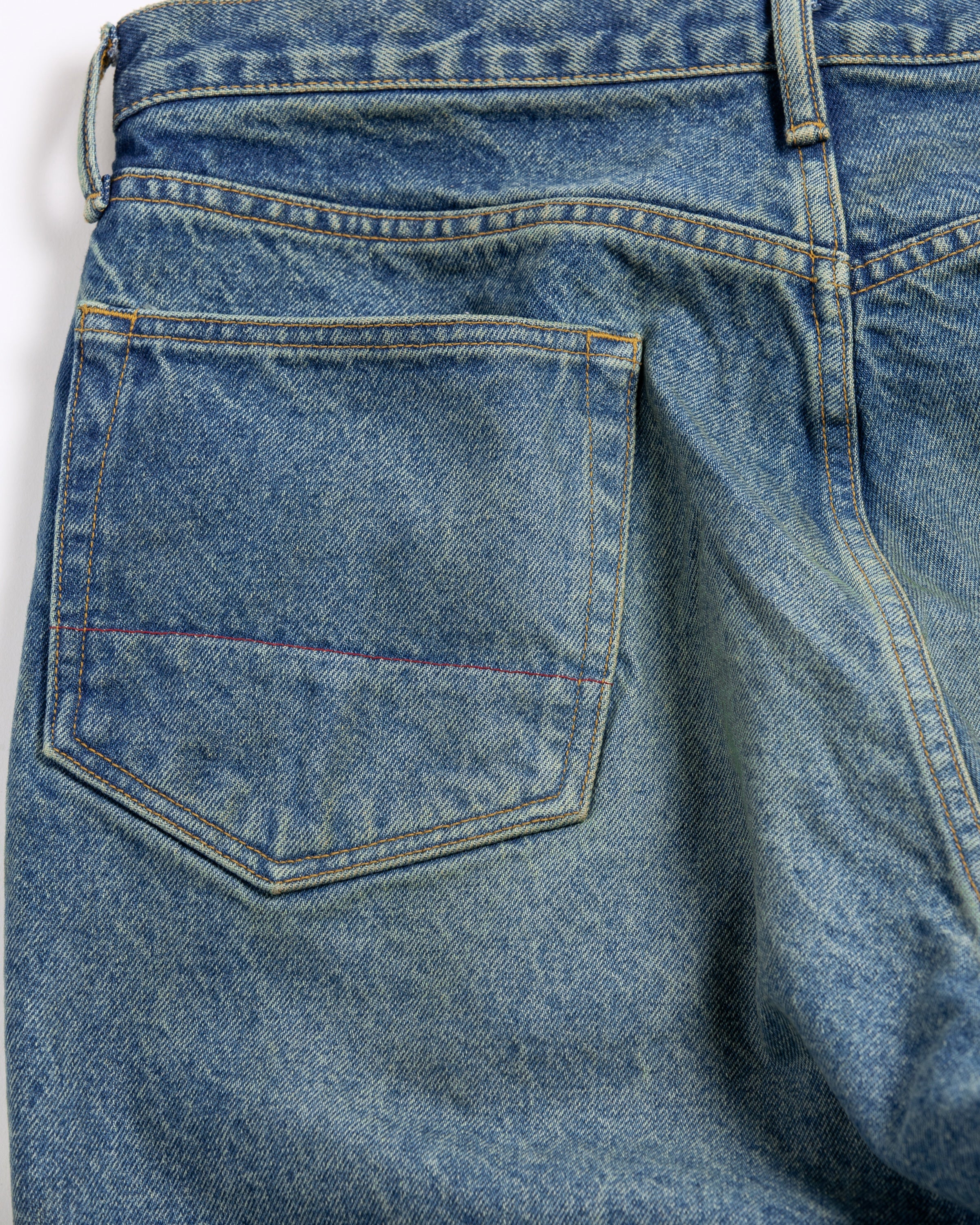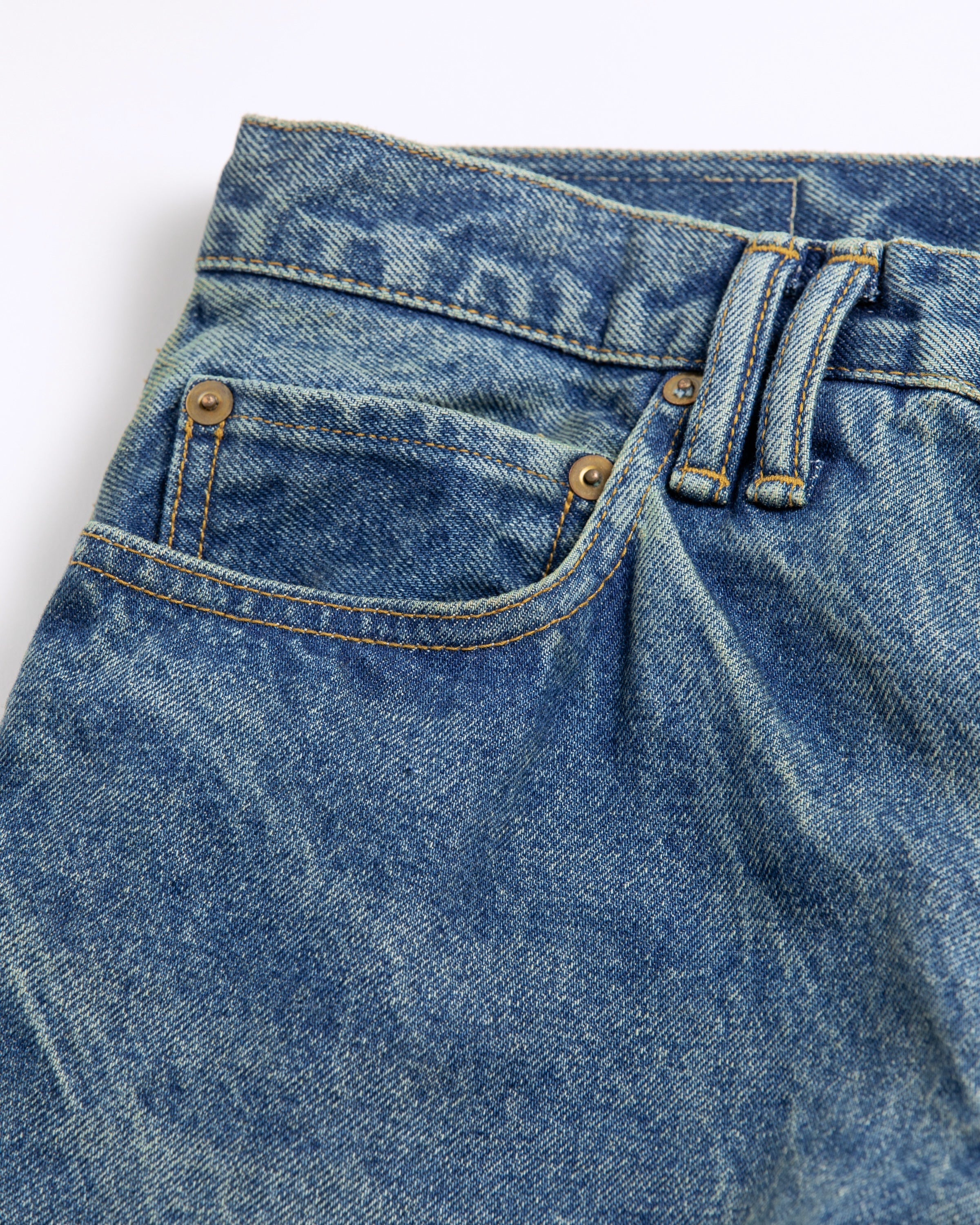[FIVE YEARS WASH]FIVE Year.中濃色エイジング仕上げ 高頻度で5年ほど着用した状態を表現。全体的に色落ちした色味とハードなアタリ感が特徴。 FIVE Year. Medium Dark Aged Finish Replicates the look of about five years of frequent wear. Characterized by an overall faded tone and pronounced, hard wear marks.