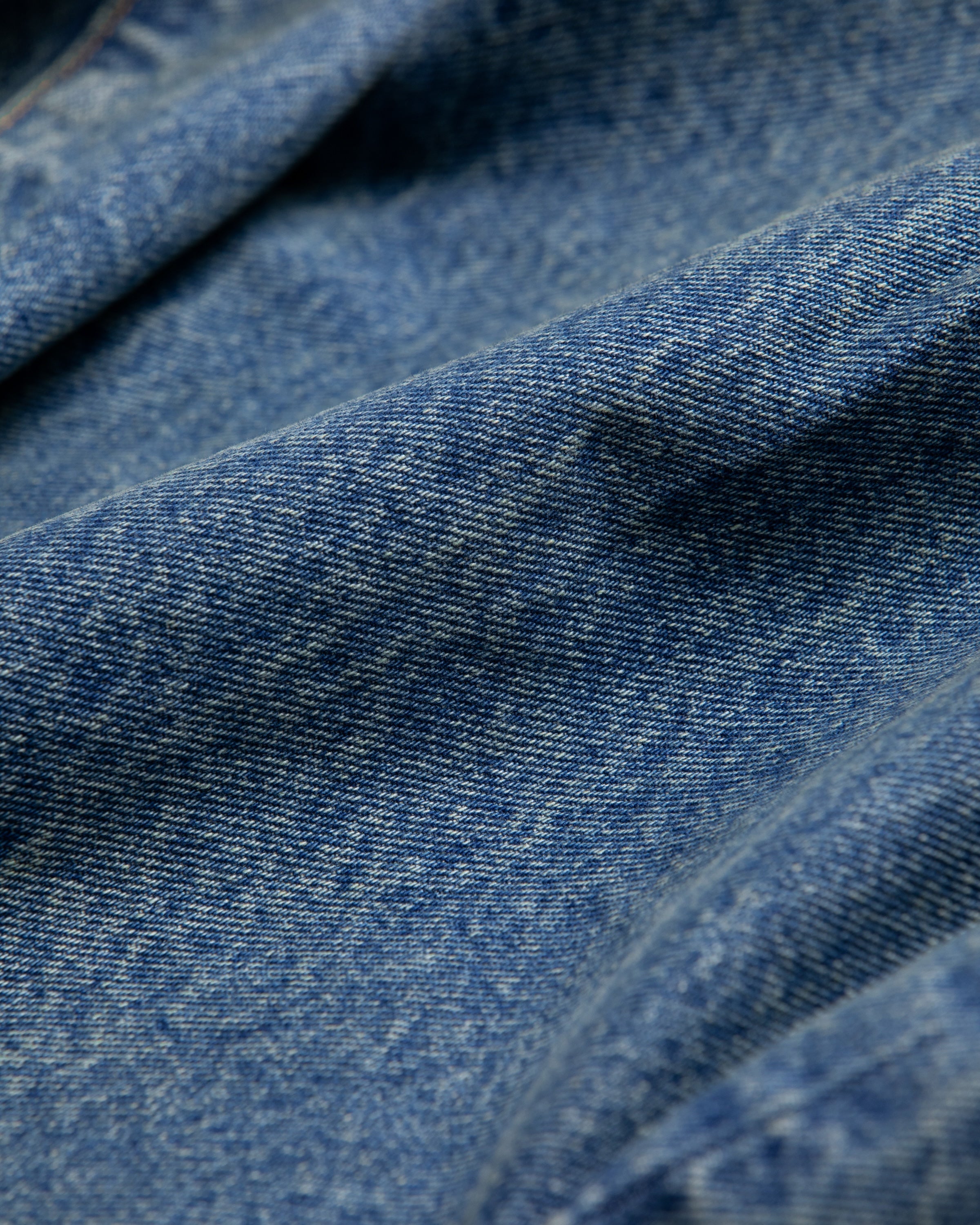 Reproduction of denim (Hachimaru) from the period when Levi's shifted from eared to earmarked denim. It has a flat look that is different from the vintage denim, which had a pronounced uneven yarn.