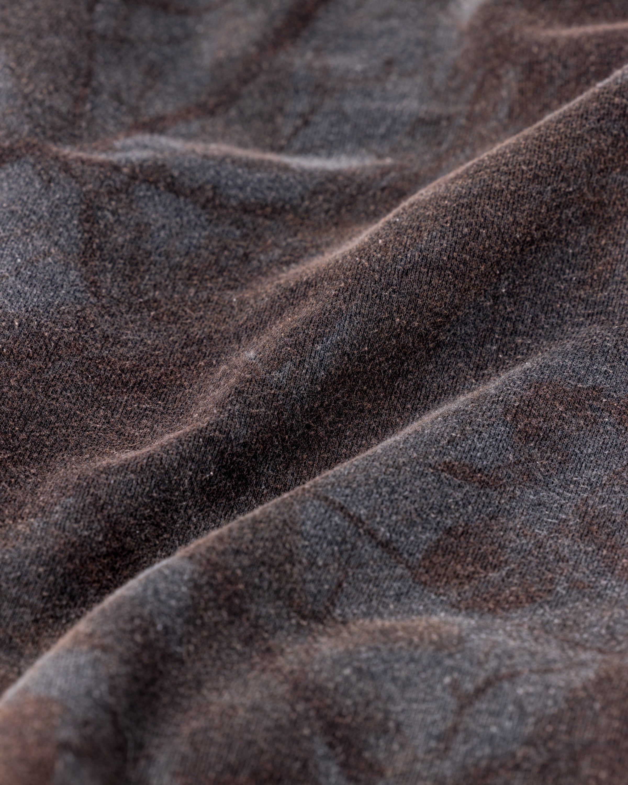 After being garment-dyed with sulphur dyes, a specialized waterless bleaching process is applied.