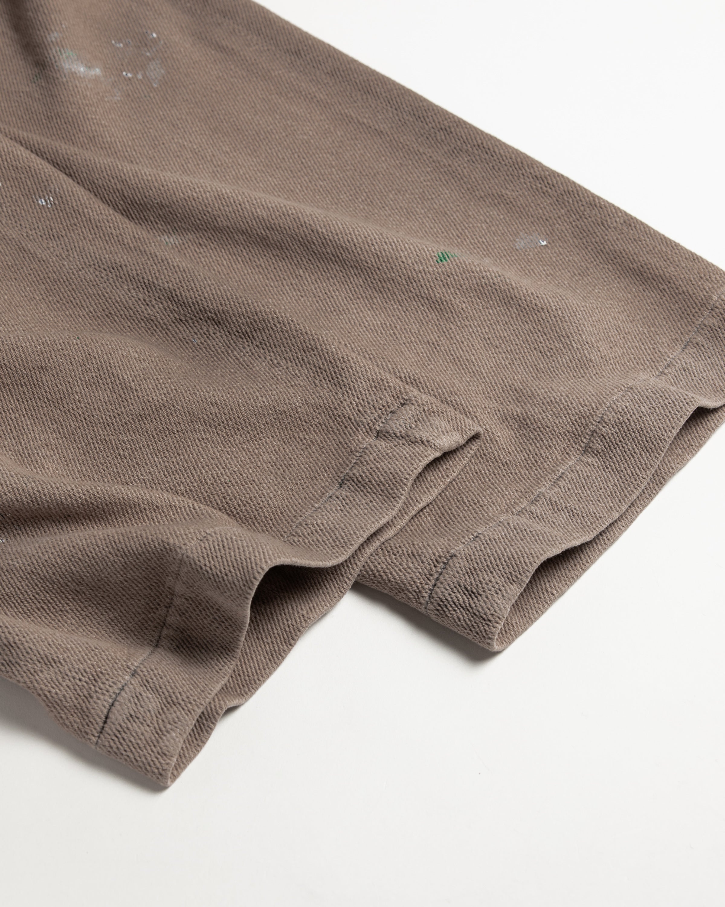 After the spraying process, the garment is washed to create a unique look where the dye partially wears off, resulting in a distinctive weathered appearance.