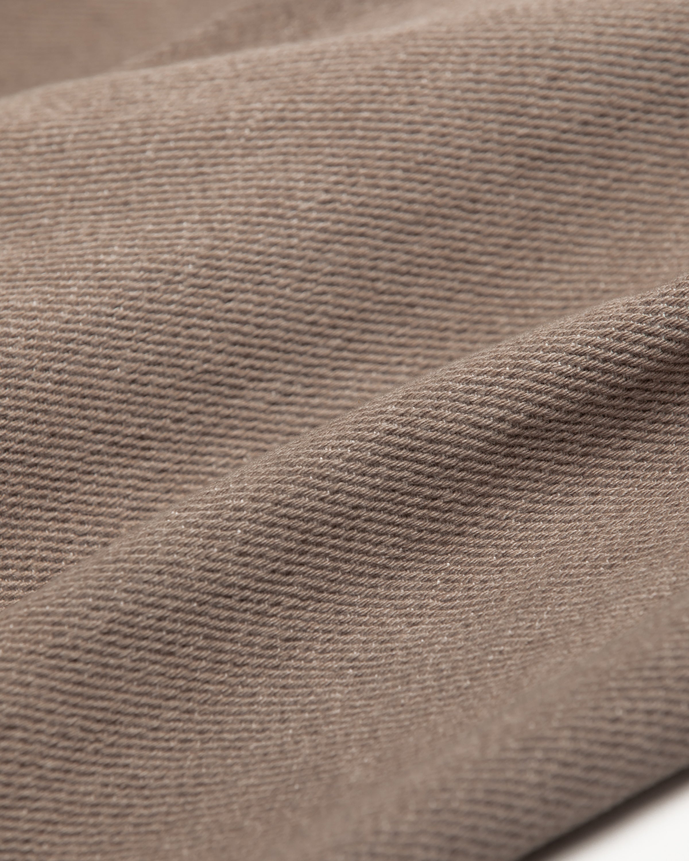 This fabric is woven using No. 9 low-slub yarns for both the warp and weft, with a special dobby weave structure that creates a pronounced twill pattern.