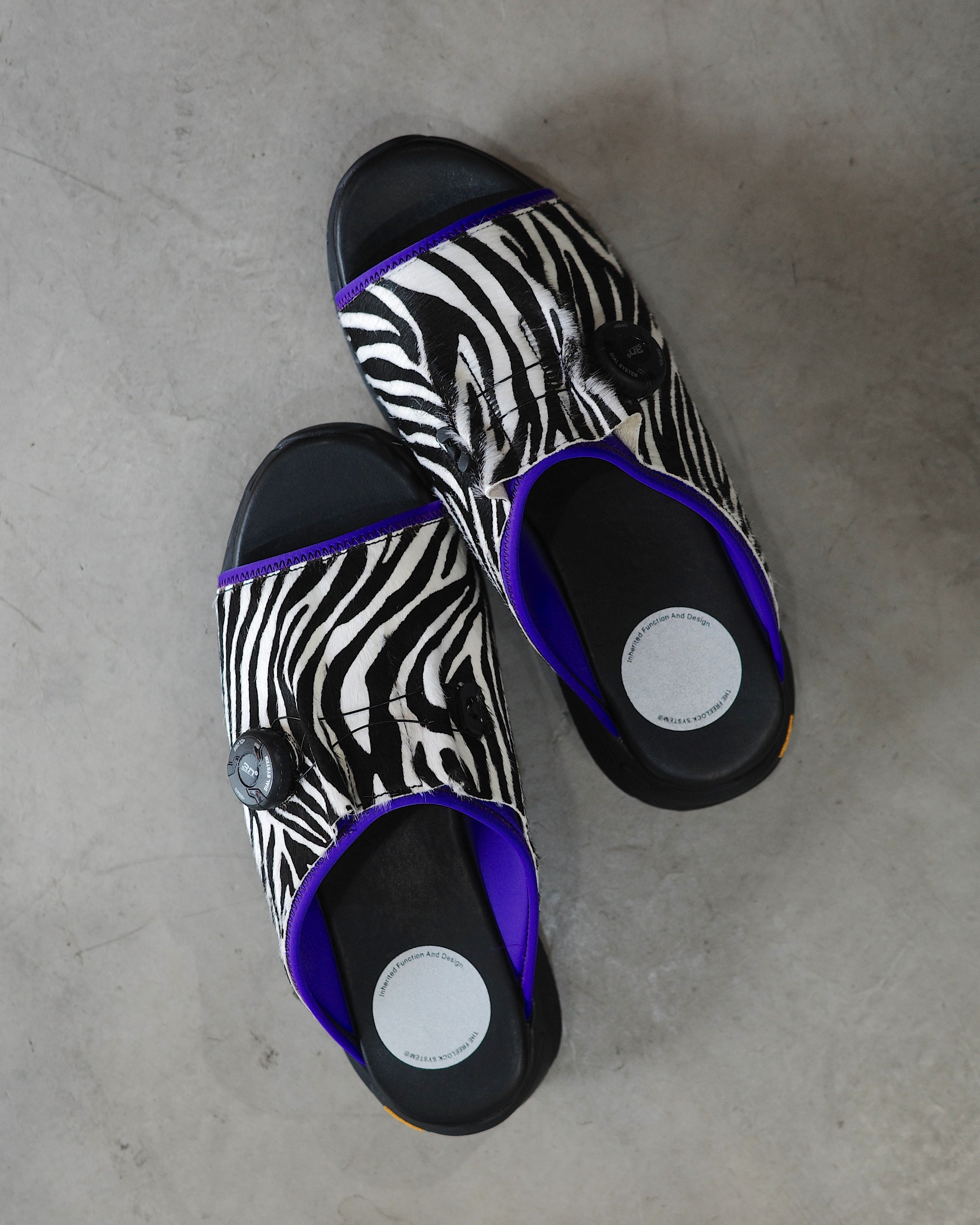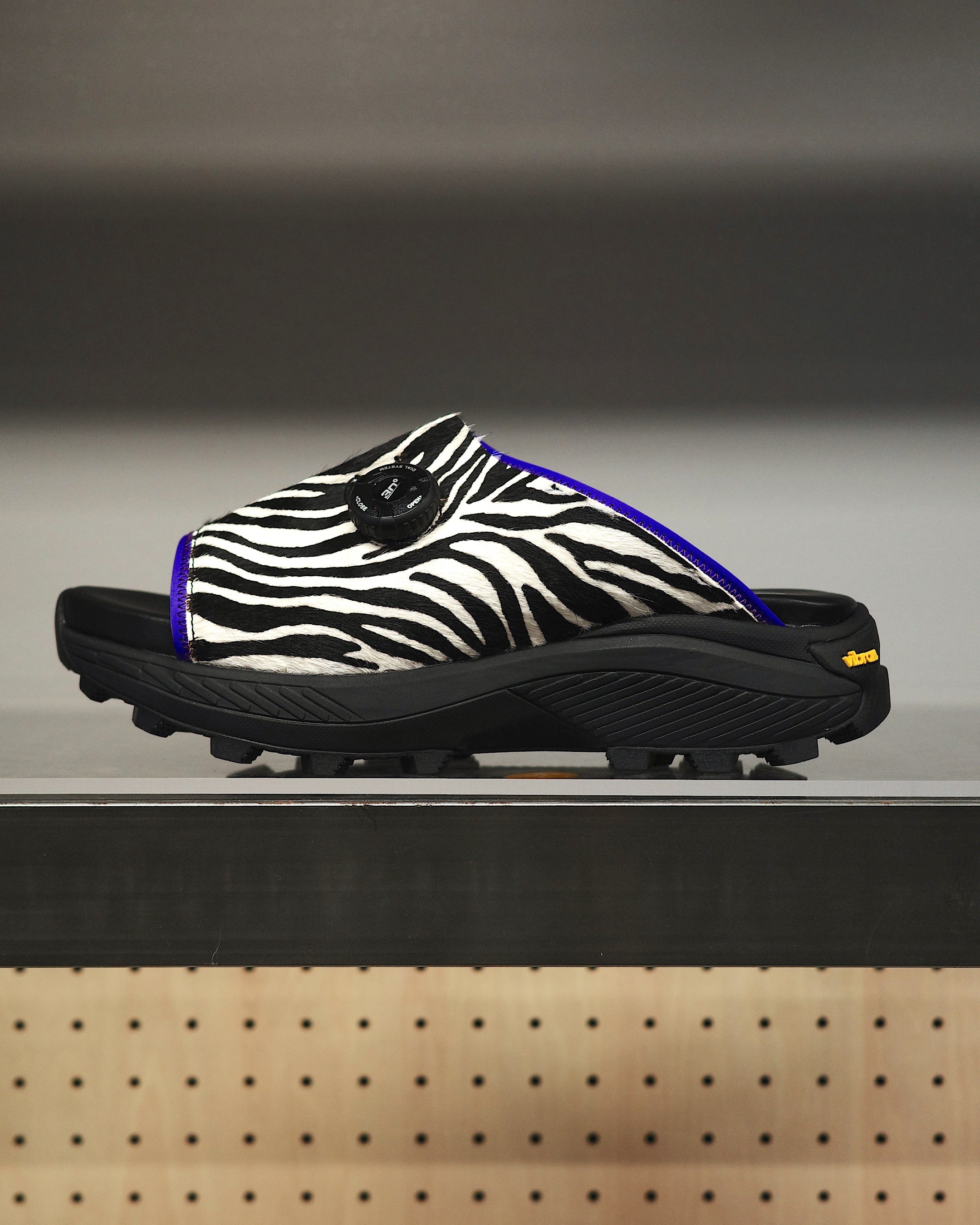 外側はホースヘア・ハイド(馬・毛革)で、ダーツを入れてFREELOCKシステムによりアジャストできる仕様です。足にあわせて締めることで、ダーツ部にシワが寄りこのサンダルならではの表情も楽しめる1足です。