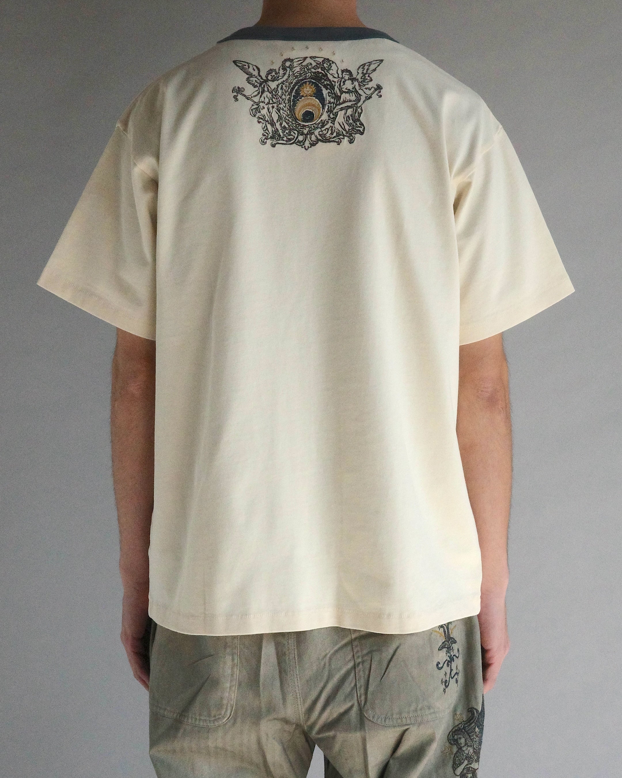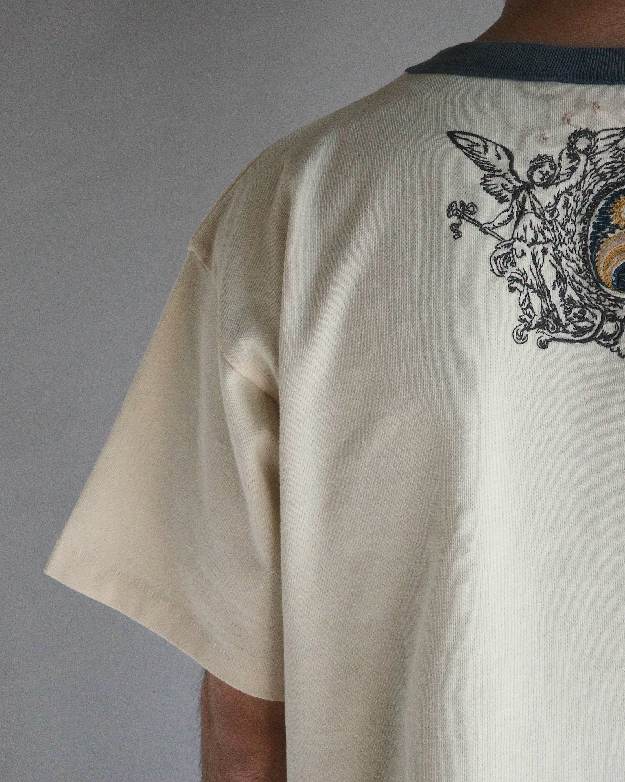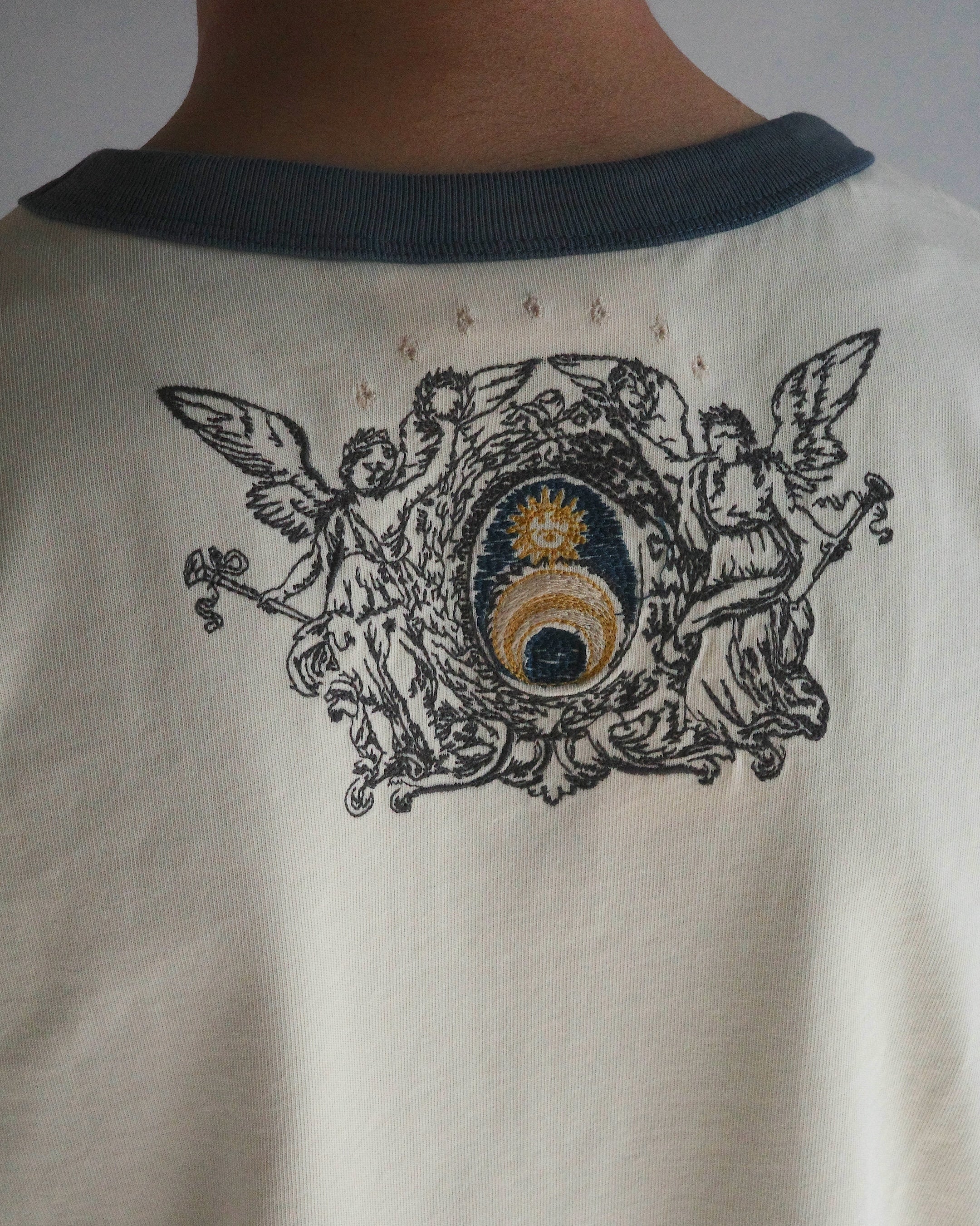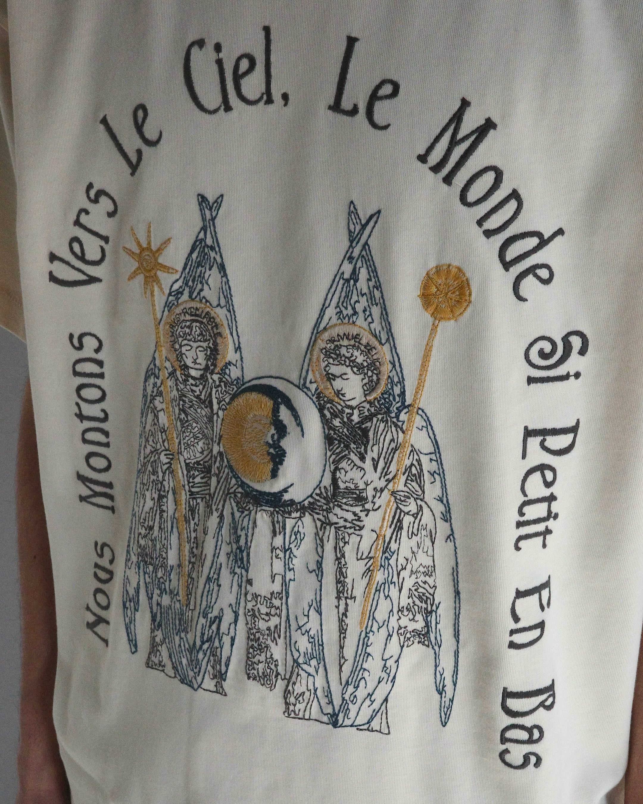 A T-shirt embroidered with designs inspired by celestial romanticism.
